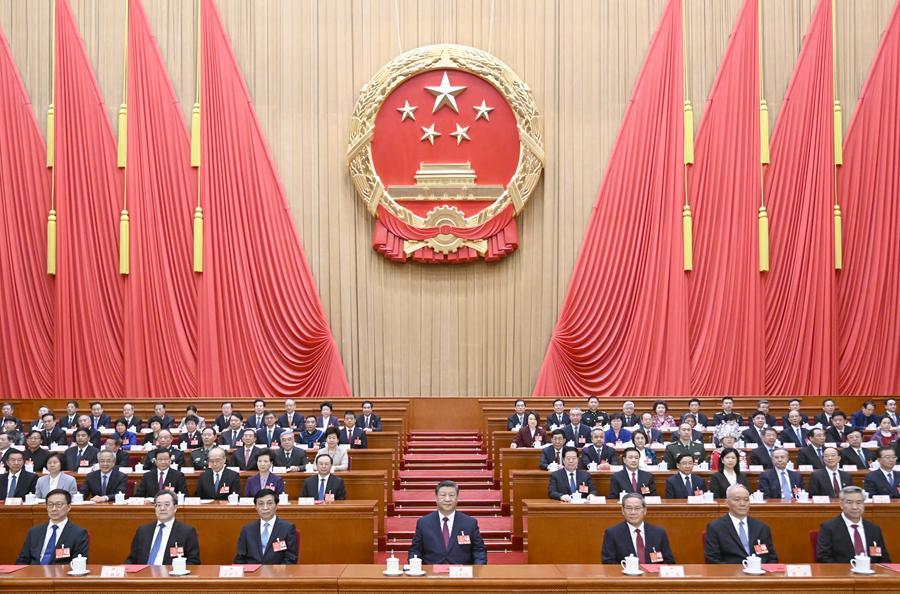 習近平、李強、王滬寧、蔡奇、丁薛祥、李希、韓正和大會主席團成員在主席臺就座。