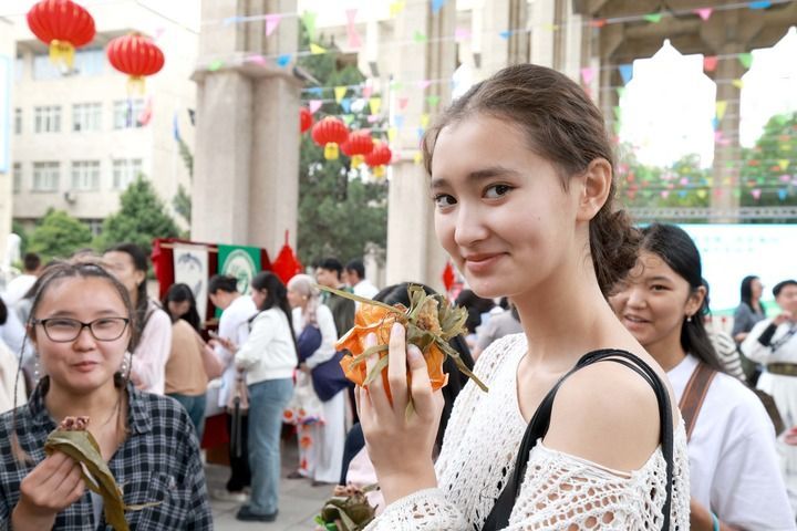 2025年5月30日,在吉爾吉斯斯坦比什凱克,人們在比什凱克國立大學舉行的“粽香傳情·共慶端陽”端午民俗節上品嘗粽子。新華社發(羅曼攝)