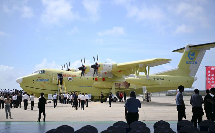 2025年6月11日在珠海中航通飛華南飛機工業有限公司拍攝的批量生產的首架AG600飛機。當日,大型水陸兩棲飛機AG600“鯤龍”獲頒中國民航局生產許可證,標志著AG600飛機正式邁入批量生產階段。新華社記者 鄧華 攝
