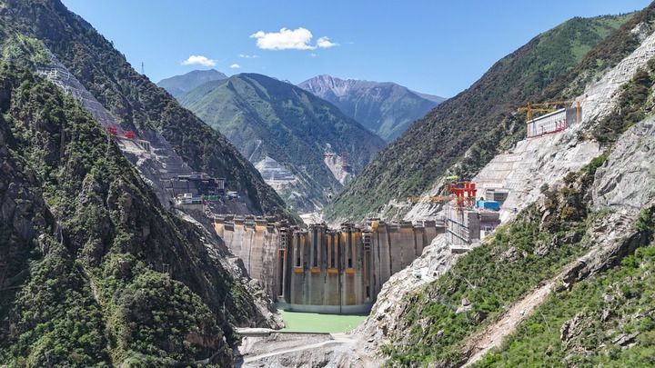 這是2025年6月30日拍攝的建設中的葉巴灘水電站(無人機照片)。該水電站地處四川甘孜州白玉縣與西藏昌都市貢覺縣交界處的金沙江上游,總裝機容量224萬千瓦。新華社發(陳浩 攝)