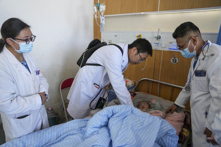 來自大連醫科大學附屬第一醫院的援藏醫生田聰亮(左二)和同事在西藏那曲市人民醫院查房(2025年7月18日攝)。新華社記者 晉美多吉 攝