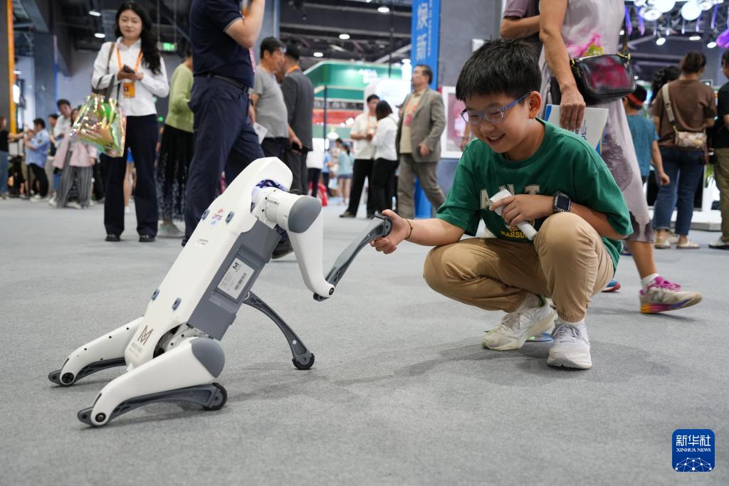 9月13日,小朋友在服貿(mào)會展館內(nèi)與機器狗握手。