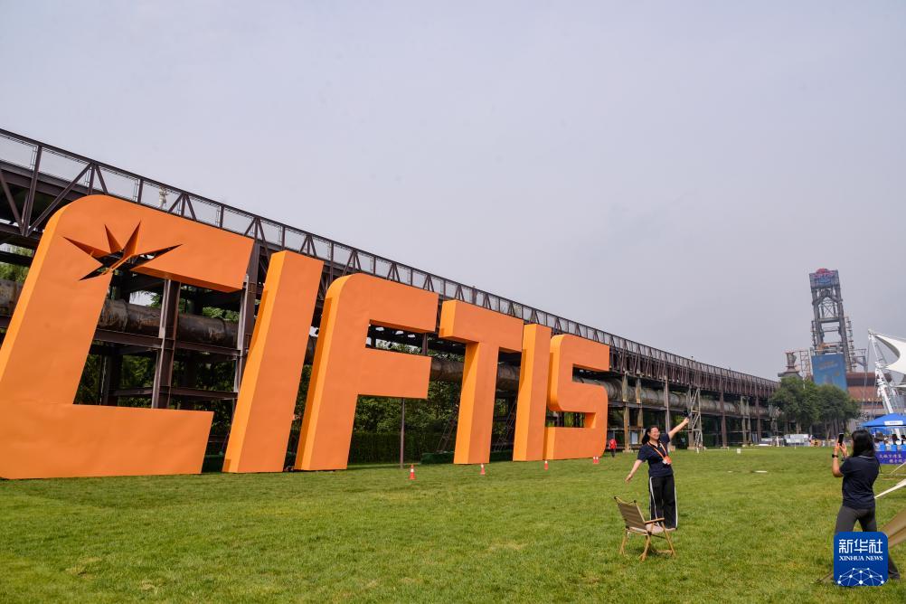 9月13日,工作人員在北京首鋼園一處服貿(mào)會英文標識前留影。
