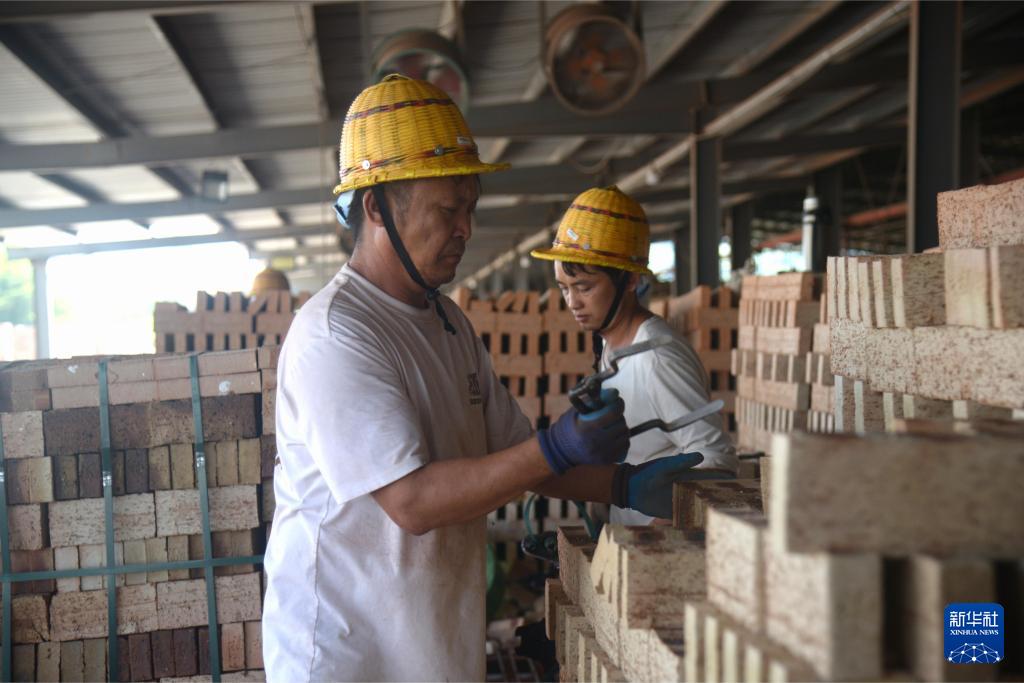 在福州閩侯縣一家建筑垃圾資源化利用企業(yè)的生產(chǎn)園區(qū),一批建筑垃圾制作的磚塊燒制完成,工人們?cè)诤Y選、捆扎(9月13日攝)。