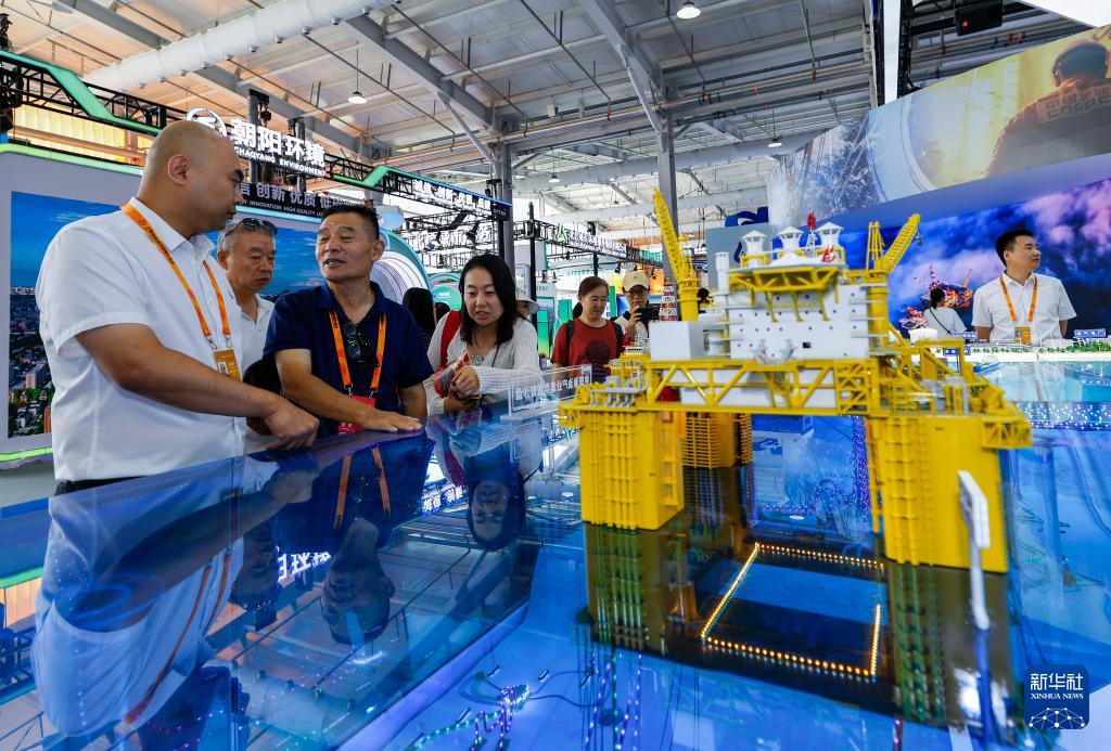 9月14日,觀眾在環境服務展區中國海洋石油展臺前觀看模型。