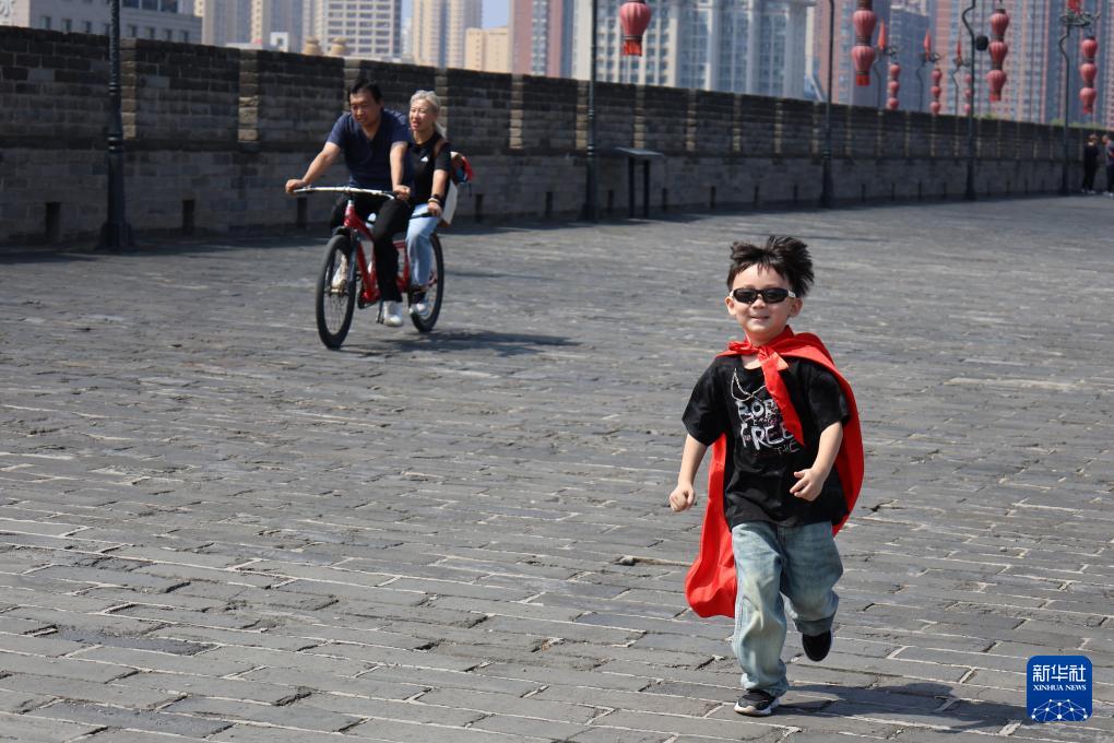 9月12日,游客在西安城墻永寧門內游覽,左側城墻上布設著墻體裂縫監測儀。