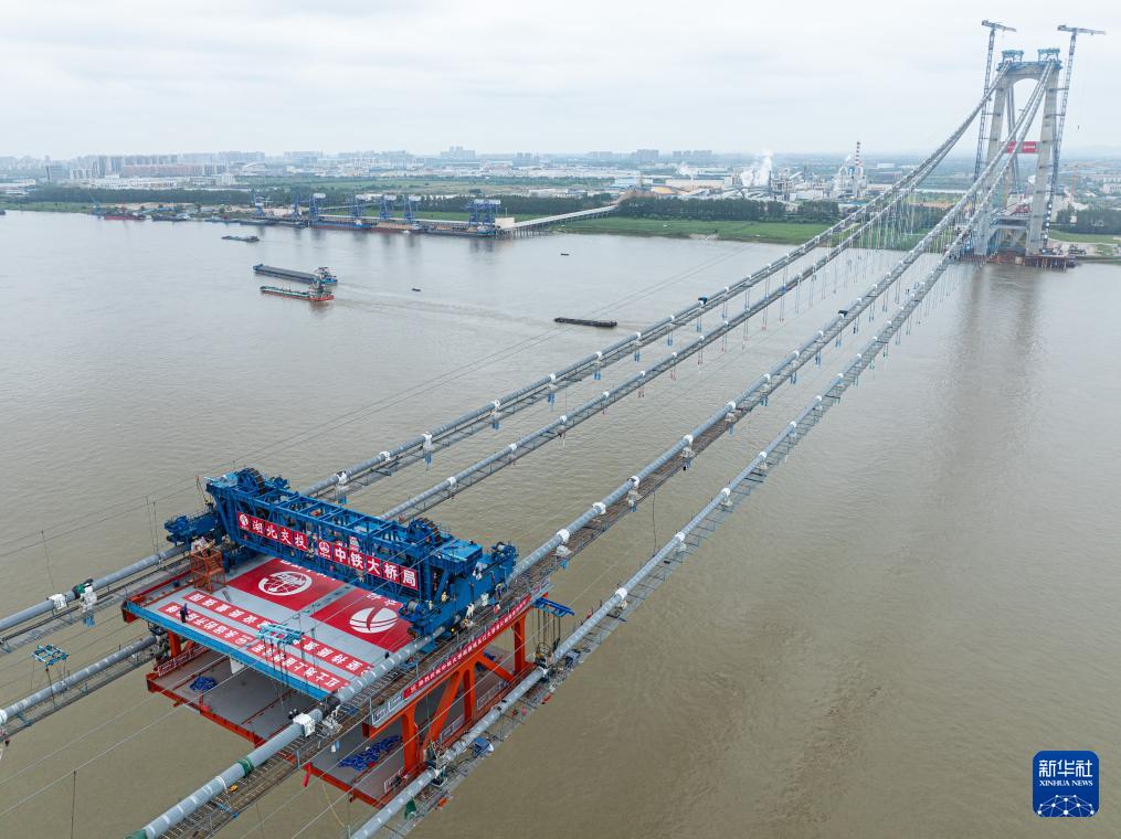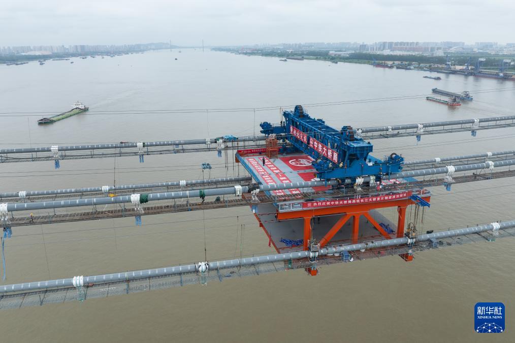 9月20日拍攝的燕磯長江大橋主跨鋼梁架設施工現場(無人機照片)。