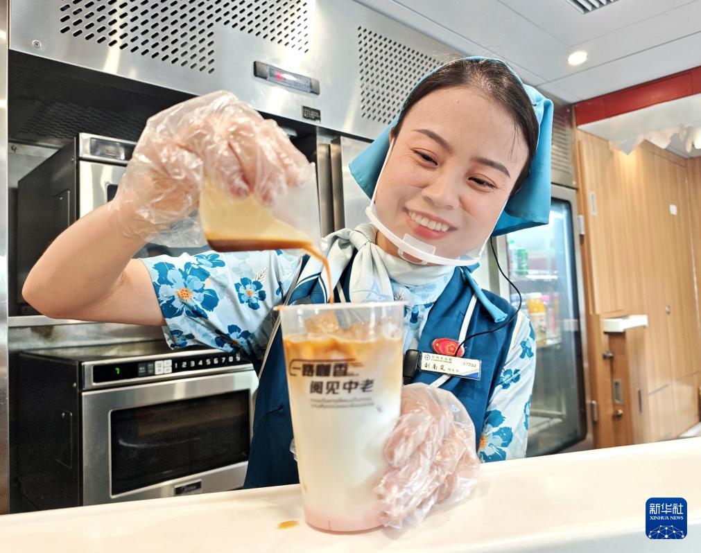 9月20日,工作人員在中老鐵路列車上制作玫瑰特調(diào)咖啡。