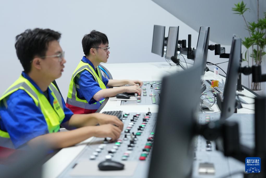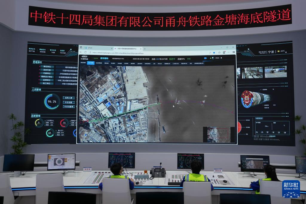 9月22日,中鐵十四局技術人員在甬舟鐵路金塘海底隧道“甬舟號”盾構機操作室關注設備運行情況。
