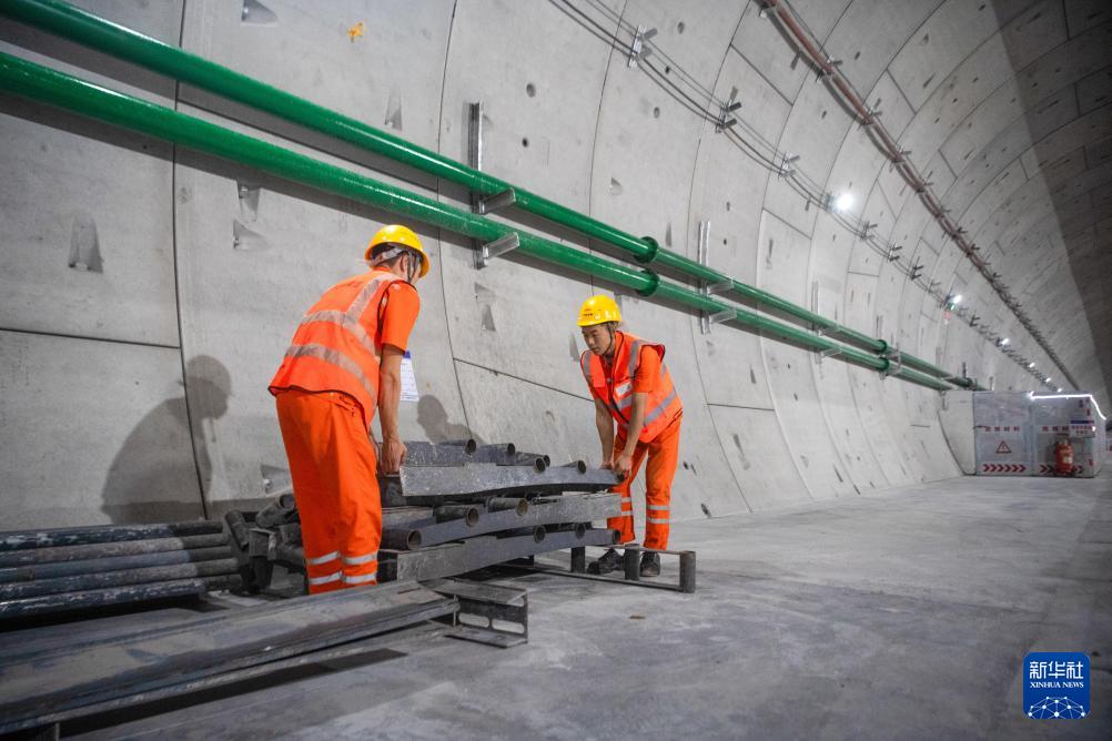 9月25日,工人在渝廈高鐵重慶菜園壩長江鐵路隧道建設現場施工作業。