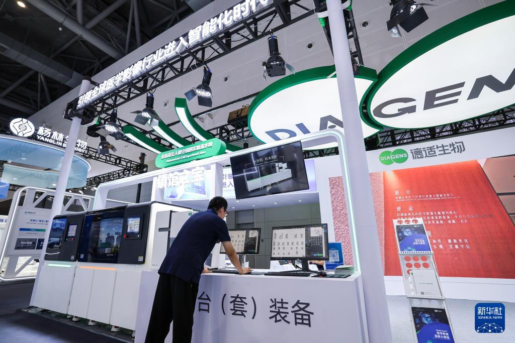 這是9月25日在第四屆全球數(shù)字貿(mào)易博覽會(huì)數(shù)字醫(yī)療展區(qū)拍攝的德適生物自主研發(fā)的“全自動(dòng)無(wú)人值守細(xì)胞實(shí)驗(yàn)流水線”。