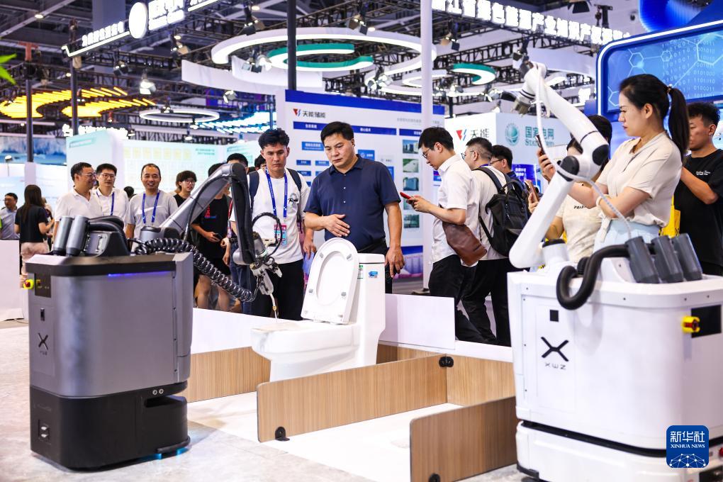 9月25日,觀眾在第四屆全球數(shù)字貿(mào)易博覽會(huì)人工智能展區(qū)觀看一款自清潔機(jī)器人工作。