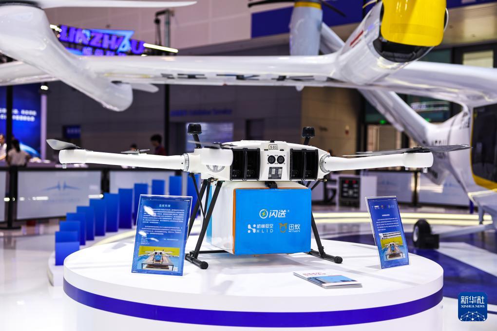 這是9月25日在第四屆全球數(shù)字貿(mào)易博覽會(huì)數(shù)智出行展區(qū)拍攝的快遞無(wú)人機(jī)。
