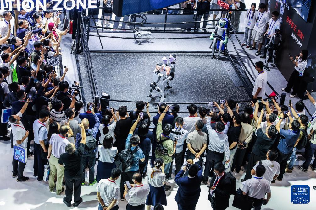 9月25日,在第四屆全球數(shù)字貿(mào)易博覽會(huì)數(shù)智未來(lái)主題展區(qū)的杭州六小龍專區(qū),觀眾觀看宇樹科技的人形機(jī)器人進(jìn)行格斗擂臺(tái)賽。