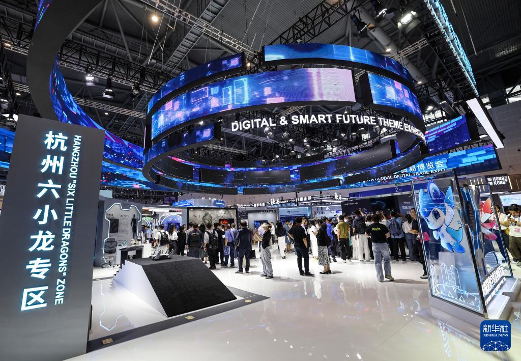 這是9月25日拍攝的第四屆全球數(shù)字貿(mào)易博覽會(huì)數(shù)智未來(lái)主題展區(qū)的杭州六小龍專區(qū)。