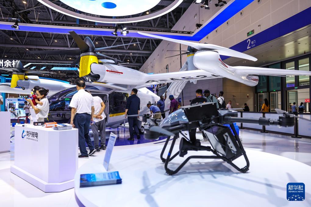 9月25日,觀眾在第四屆全球數(shù)字貿(mào)易博覽會(huì)數(shù)智出行展區(qū)參觀無(wú)人機(jī)。