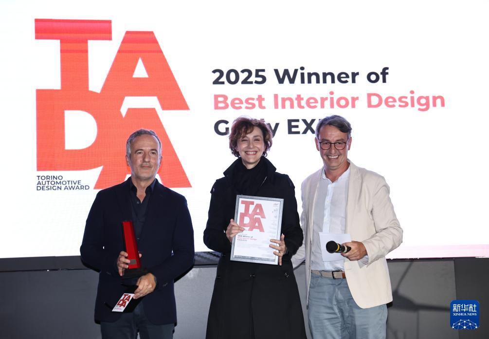 9月26日,在意大利都靈,榮獲“都靈汽車設計獎”最佳內飾設計獎的吉利“銀河E5”代表領獎。