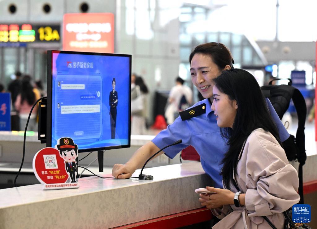 10月5日,在河北石家莊火車站候車大廳服務臺,旅客向“AI智能客服機”問詢旅行信息。