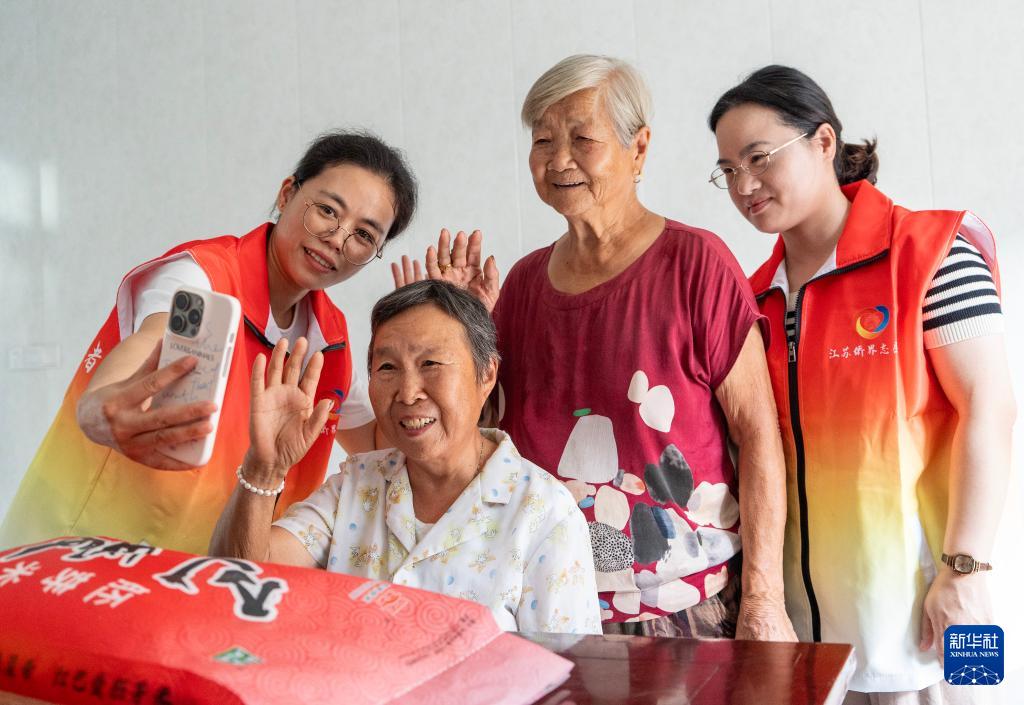 10月5日,江蘇省南通市通州區金新街道界北村志愿者幫助老人與遠在海外的子女進行視頻通話,“云端”相聚,共迎中秋。