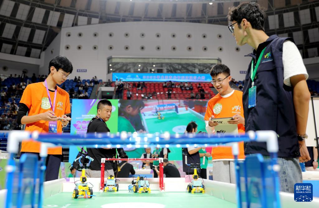 10月3日,在河南省濟源市舉行的全國青少年科技體育大賽上,參賽選手在進行機器人足球比賽。