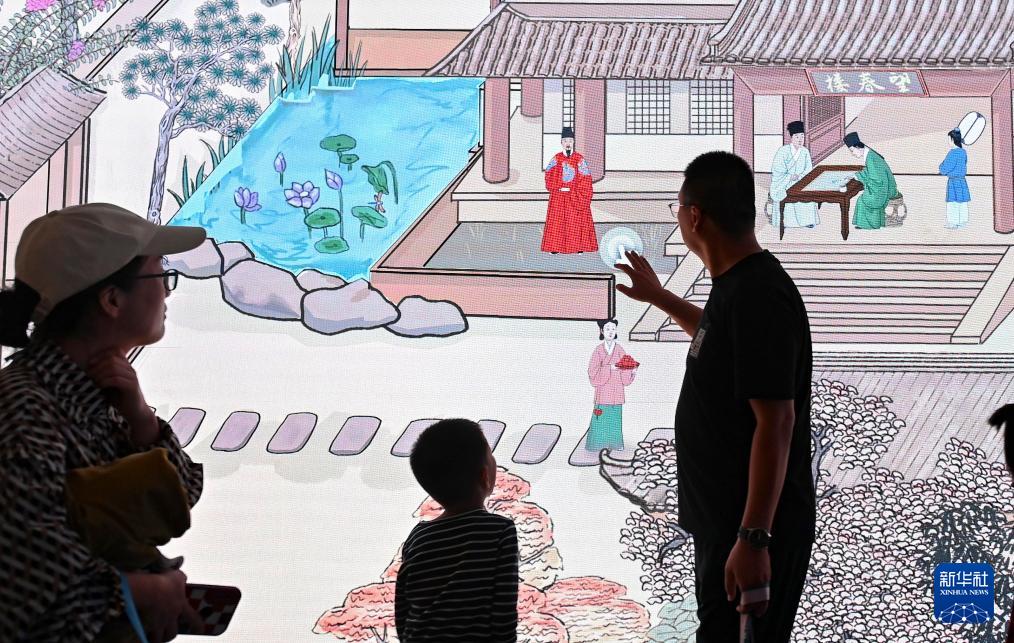 10月5日,在山東省青州博物館,游客通過大屏幕進行場景互動。