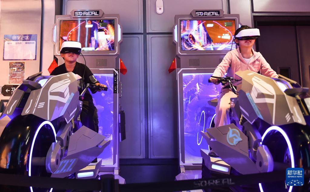 10月4日,在河南省洛陽市澗西區未來城科幻樂園內,孩子們在體驗VR虛擬技術沉浸式場景。