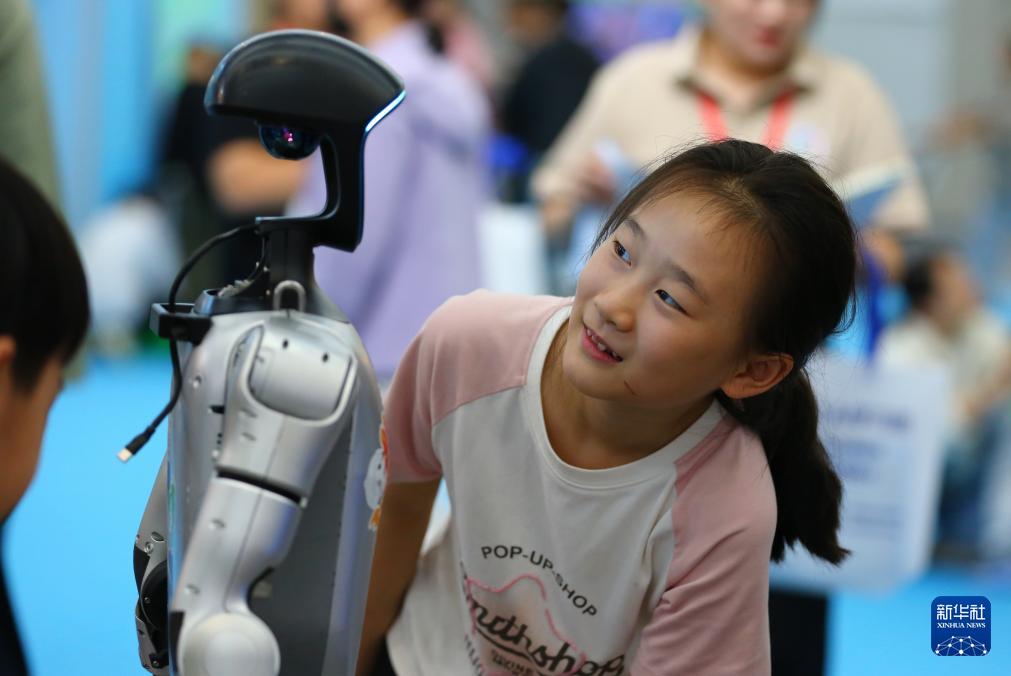 10月2日,在山東省第九屆滕州書展現場,小朋友與機器人互動。