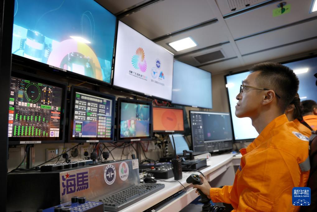 在科考船上的“海馬”號深海遙控潛水器控制室里,工作人員遙控采火裝置在海底進行作業(9月18日攝)。