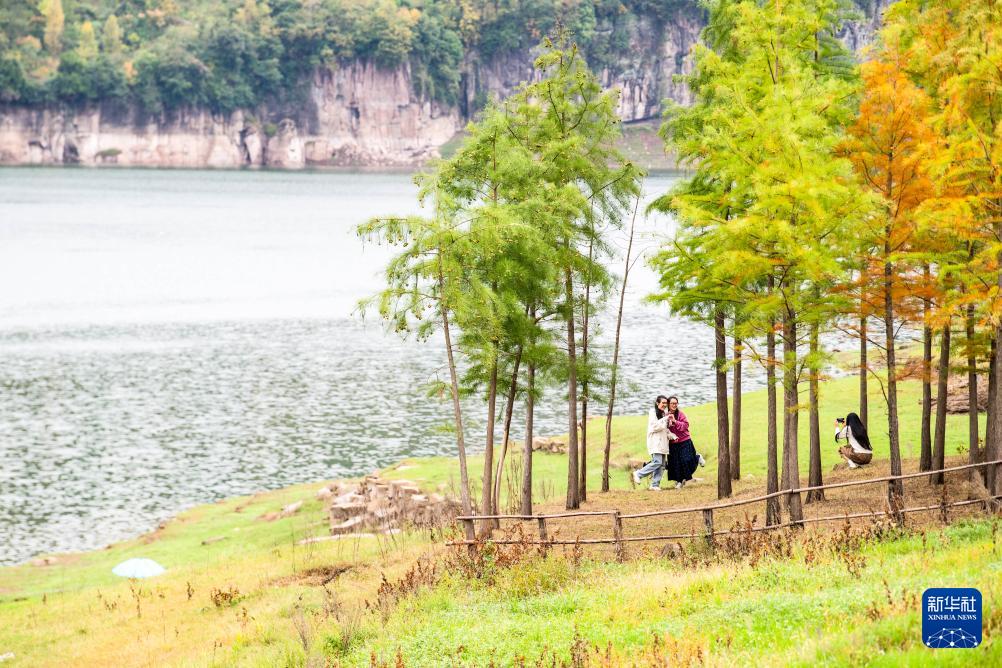 10月15日,游客在濕地公園湖畔拍照打卡留影。