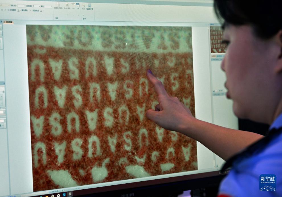 10月14日,青島機場邊檢站證研室內,移民管理警察通過光學儀器進行簽證核查。
