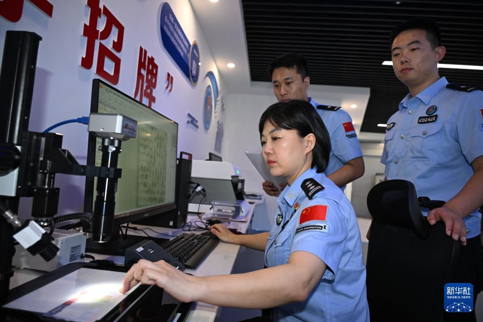 10月14日,青島機場邊檢站證研室內,移民管理警察在進行簽證核查。