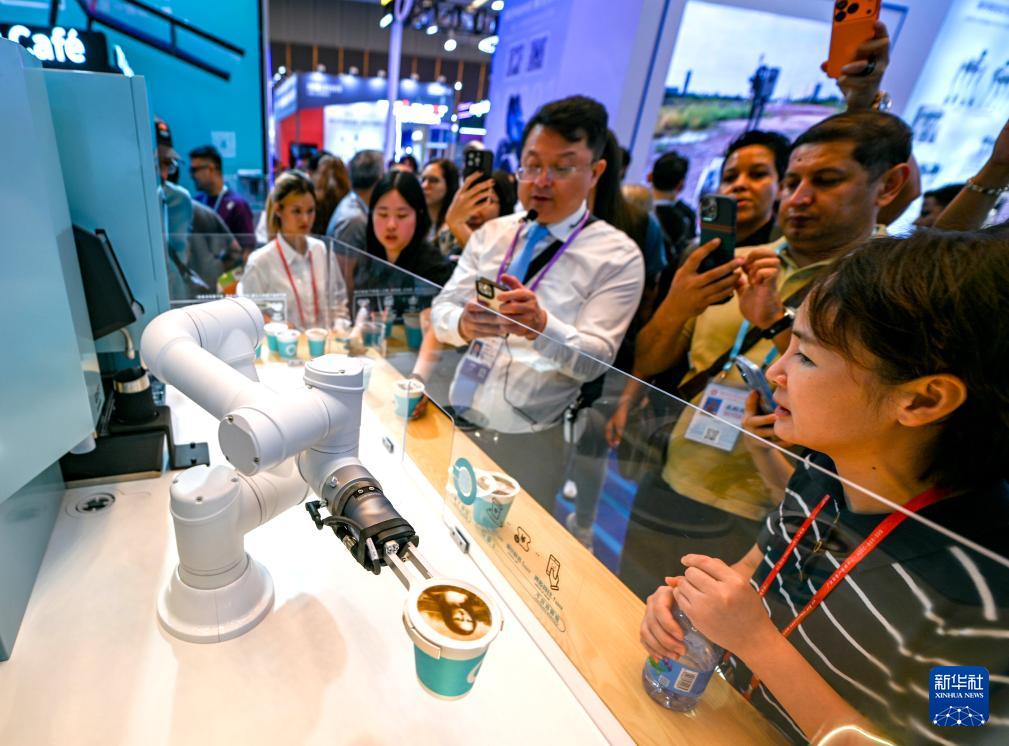 10月15日,在第138屆廣交會服務機器人專區,展商向觀眾展示一款商用咖啡機器人設備。