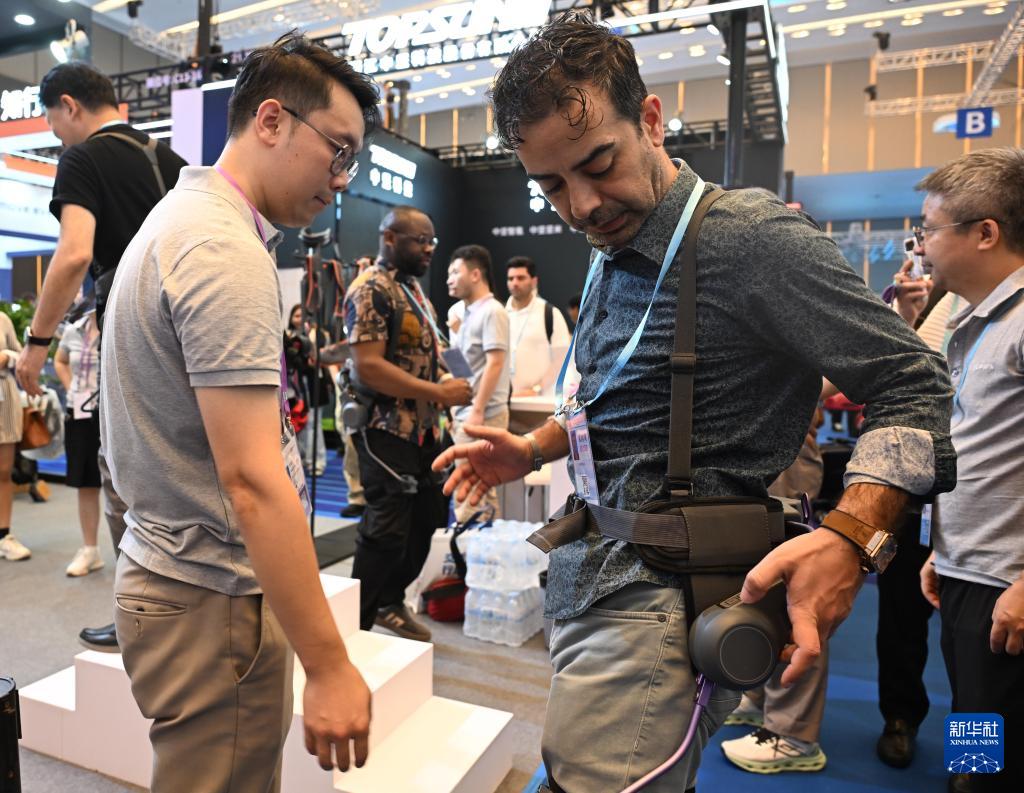 10月15日,境外采購商在第138屆廣交會服務機器人專區體驗外骨骼穿戴設備。
