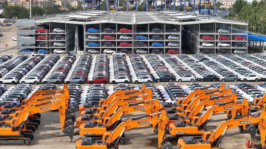 10月20日,國產(chǎn)汽車和工程機(jī)械在山東港口煙臺(tái)港集結(jié)等待裝船出口(無人機(jī)照片)。新華社發(fā)(唐克攝)