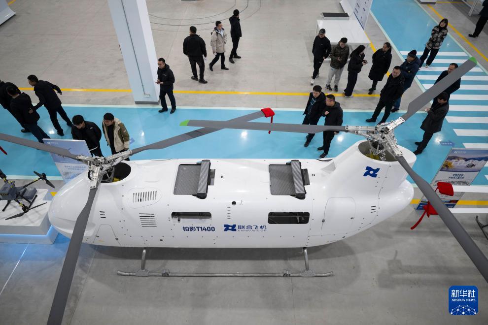 10月30日,在哈爾濱市平房區的哈爾濱聯合飛機科技有限公司生產廠區,參會人員參觀T1400無人直升機。
