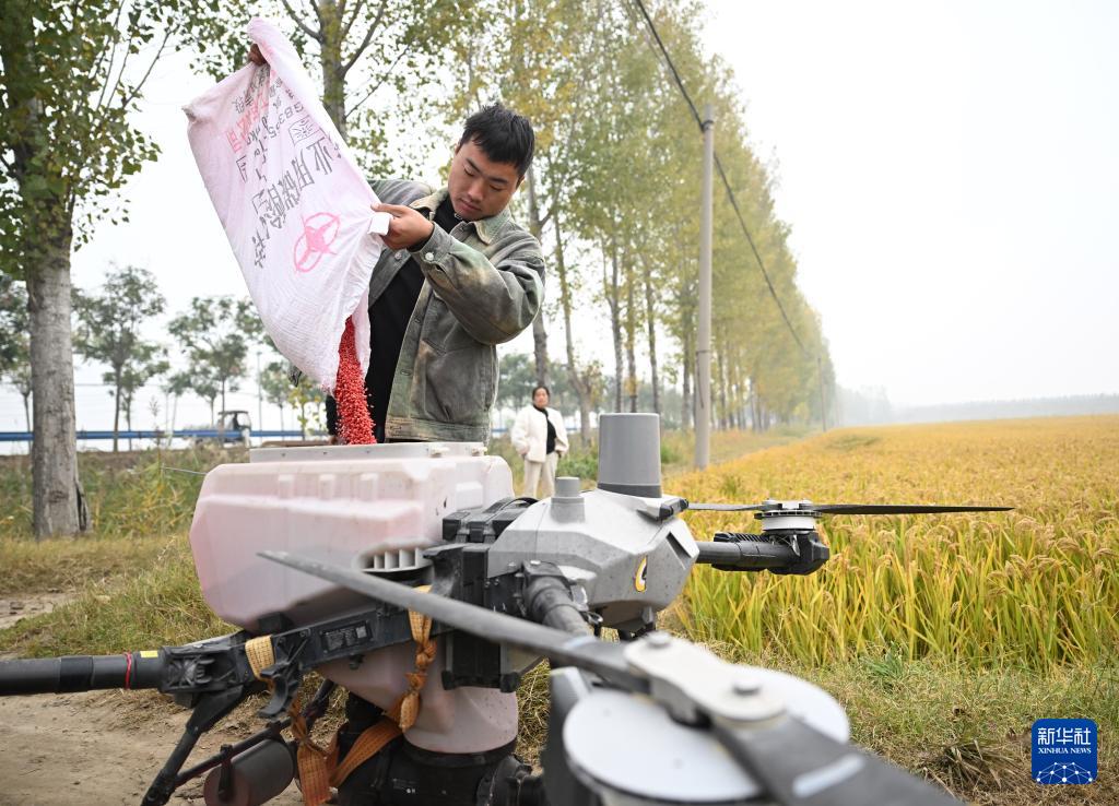 10月30日,在河南省原陽(yáng)縣太平鎮(zhèn)太南村,農(nóng)機(jī)手向無(wú)人機(jī)加載小麥種子。