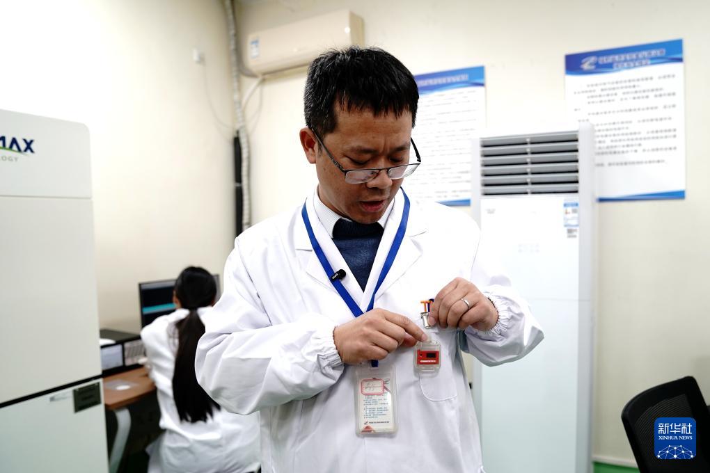 10月24日,在中國科學(xué)院上海應(yīng)用物理研究所武威園區(qū),一位工作人員在佩戴“熱釋光個人劑量計”,該儀器可隨時測量輻射的個人計量當量以確保安全。