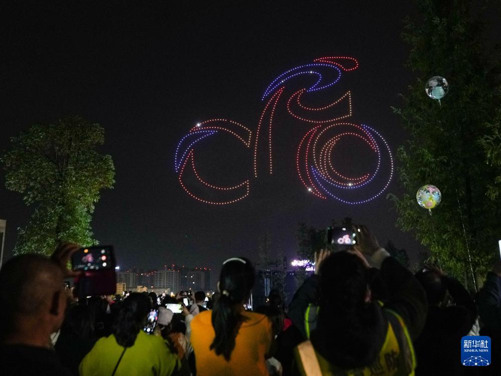 11月1日晚,2025中國公路自行車公開賽(眉山彭山站)開賽前夜,一場無人機表演點亮四川省眉山市彭山區(qū)的夜空,當?shù)厝罕娫诜沁z市集和主題音樂會等多元文化活動中享受愜意的周末時光。