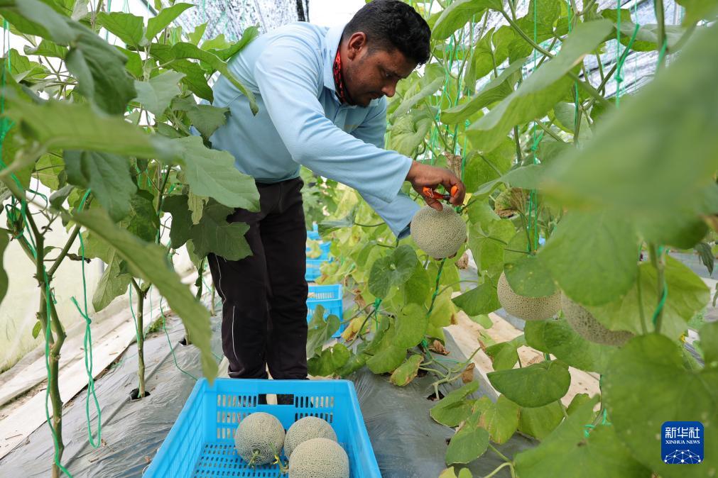 11月3日,在文萊斯里巴加灣市郊一處農業科技產業園,工作人員采摘通過中國沙培技術種植的蜜瓜。