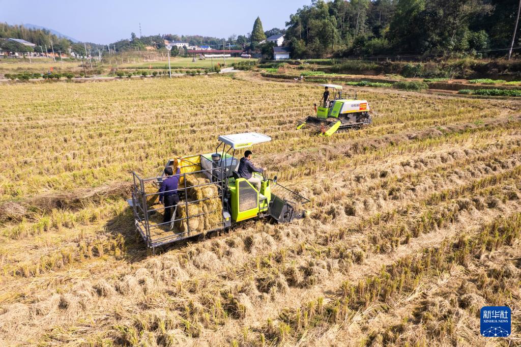 11月5日,在長沙縣開慧鎮開慧村,村民操作自走式秸稈打捆機回收水稻秸稈。