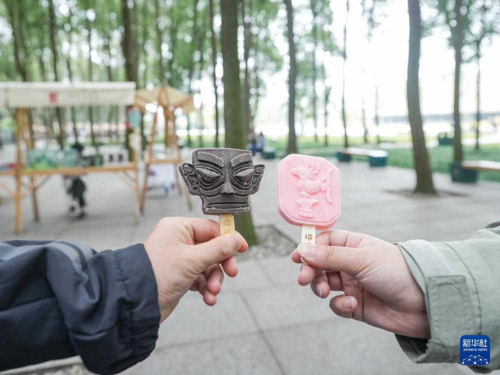 在四川省廣漢市三星堆博物館,兩名游客在展示文創雪糕產品(10月30日攝)。
