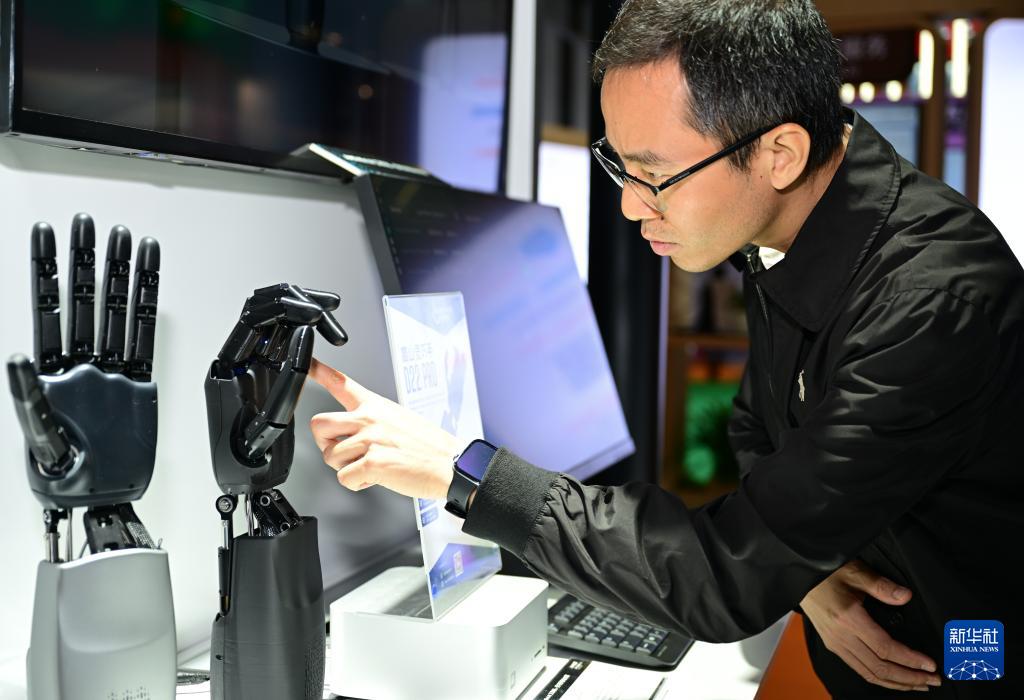 11月6日,在第八屆進博會技術裝備展區,觀眾在觸摸一款靈巧手。