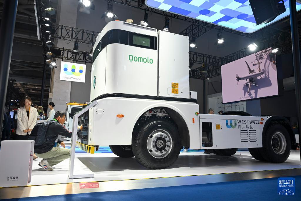 11月6日,觀眾(右)在第八屆進博會汽車及智慧出行展區西井科技展臺拍攝展品Q-Truck全時無人駕駛集卡。