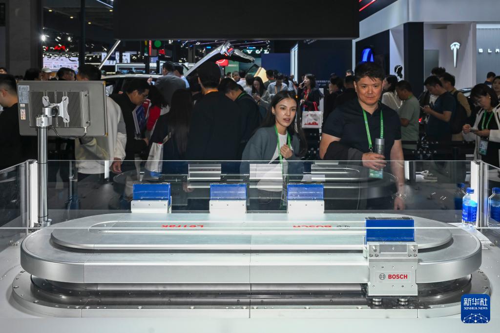 11月6日,在第八屆進博會汽車及智慧出行展區博世展臺,人們在展品LeTrak?磁驅柔性傳輸系統Pro版前交流。