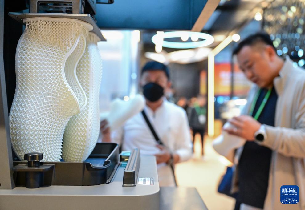 這是11月6日在第八屆進博會技術裝備展區拍攝的一款全3D打印鞋。