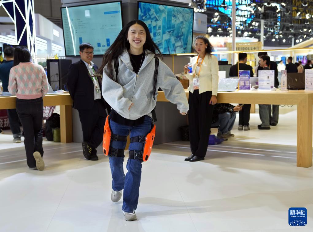 11月6日,在第八屆進博會技術裝備展區,參觀者體驗穿戴機械外骨骼運動。