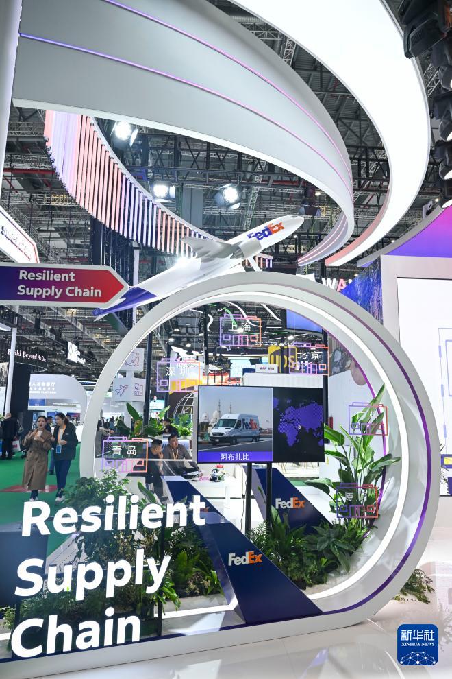 11月9日,人們在第八屆進博會服務貿易展區聯邦快遞(FedEx)展臺交流。