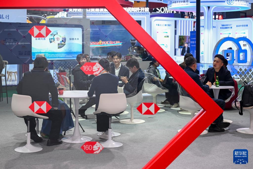 11月9日,人們在第八屆進博會服務貿易展區匯豐展臺交流。