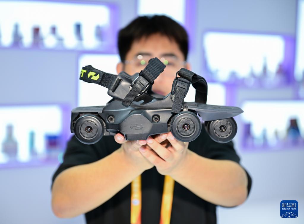 11月8日,在第八屆進博會消費品展區天貓國際展位拍攝的一款輪式外骨骼機器人。這款外骨骼機器人可以套在普通鞋子上用于提升步行速度。
