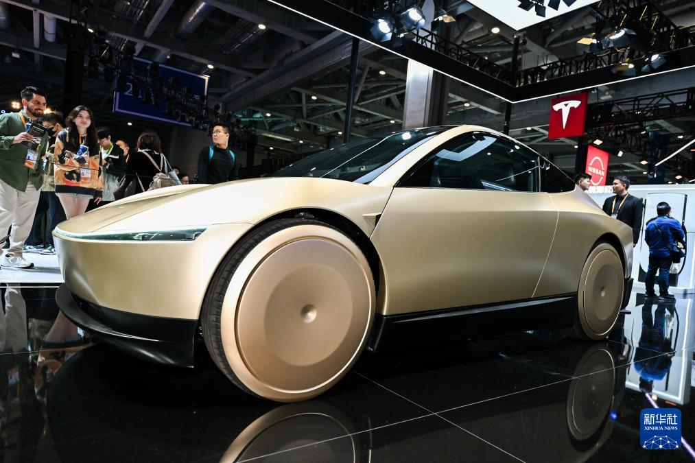 11月8日,在第八屆進博會汽車及智慧出行展區特斯拉展位,觀眾在參觀特斯拉賽博無人駕駛電動車。